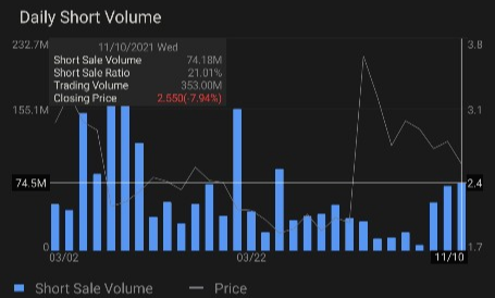 11월 10일(수) 보리협흠(03800.HK)의 숏포지션(공매도) 비율은 약 21%이고 공매도 수량도 7.4천만주 정도로 거래량 대비 비율이 꽤 커서 주요 주가 하락의 원인으로 지목되고 있습니다. 기술적으로는 이미 공매도 포지션이 하락폭이 꽤 되었기에 수익률이 클 것으로 보이면서 자신감 있게 역불타기를 한 모습입니다. 2021년 초 주가가 급상승할 때 몇 번 공매도 세력이 엄청나게 포지션 늘렸다가 크게 손실이 난 것을 아래 그림에서 알 수 있는데 이번에 남향거래가 끊어진 상태에서 환경이나 기술적 관점에서 본다면 유리하게 포지션을 잡겠다는 의도일 수도 있겠다는 생각입니다. 들리는 이야기로는 기관들 뿐만 아니라 푸투(futu.com)을 포함 몇몇 증권사를 통하면 개인들도 공매도를 할 수 있다는 말도 있었습니다. 시장에서 트레이딩 관점에서 볼 때 과매도 또는 과매수는 늘 되돌림도 나오긴 하는데 오늘 어떤 전개가 될지 또 살펴봐야 하겠습니다.