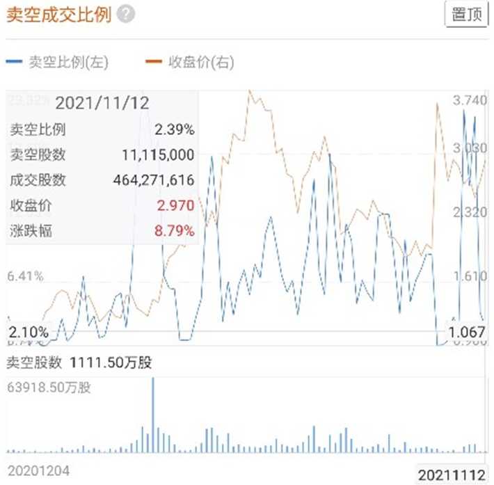11월 12일(금)에 출현된 보리협흠에너지(03800.HK)의 남향거래 비중은 16.89%이고 전날 16.97%에 비해 소폭 줄어들었지만 대동소이했다. 하지만 실제 매물상으로는 Futu.com에서 확인하 바로는 약 1.8천만주로 전날 9천만주에 비해서 매물이 상대적으로 대폭 줄어들었다. 쉬저우 2만톤 입상실리콘 양산의 공식적 발표에 따른 주가 상승으로 인해 영향을 받은 것으로 본인다.