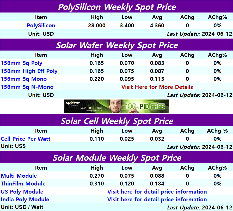 2024년 6월 2주, 태양광 폴리실리콘 및 웨이퍼, 셀, 모듈 가격 동을 주요 사이트를 통해서 가격 동향을 살펴보겠습니다.