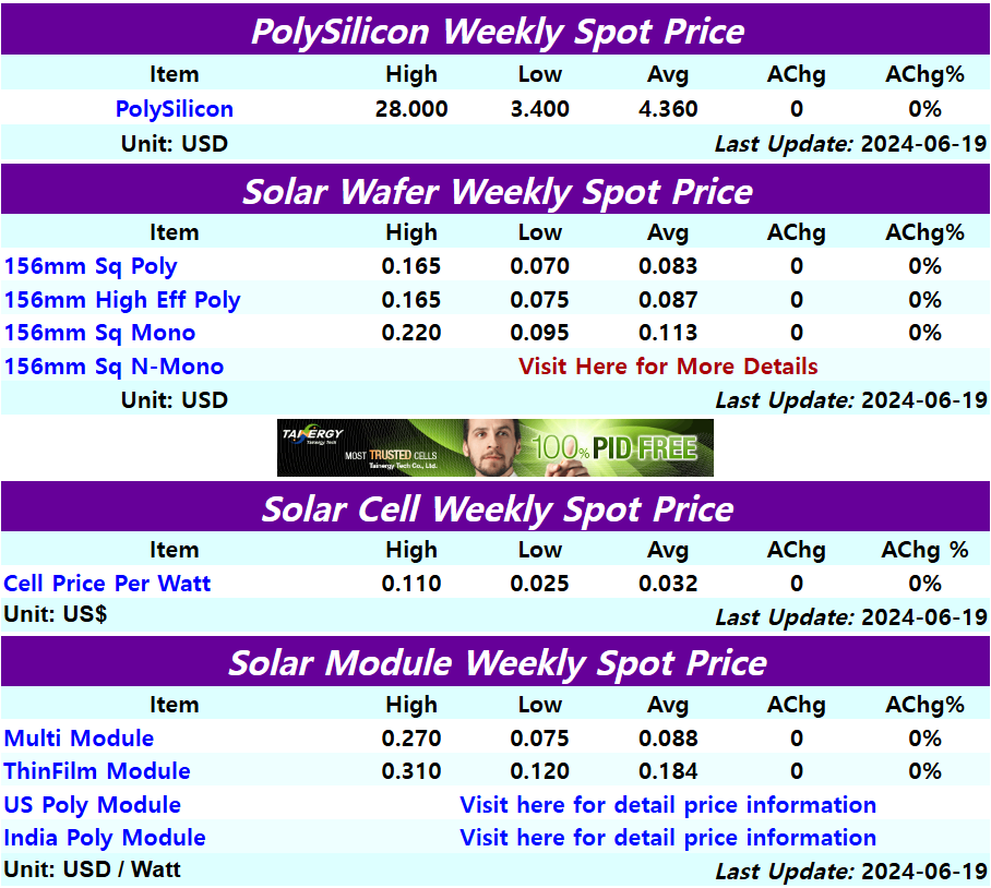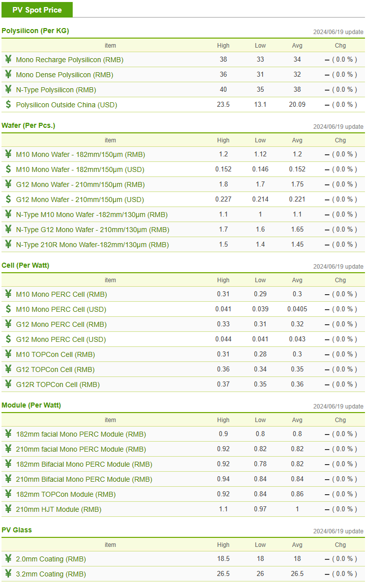 2024년 6월 3주, 태양광 폴리실리콘 및 웨이퍼, 셀, 모듈 가격 동을 주요 사이트를 통해서 가격 동향을 살펴보겠습니다.