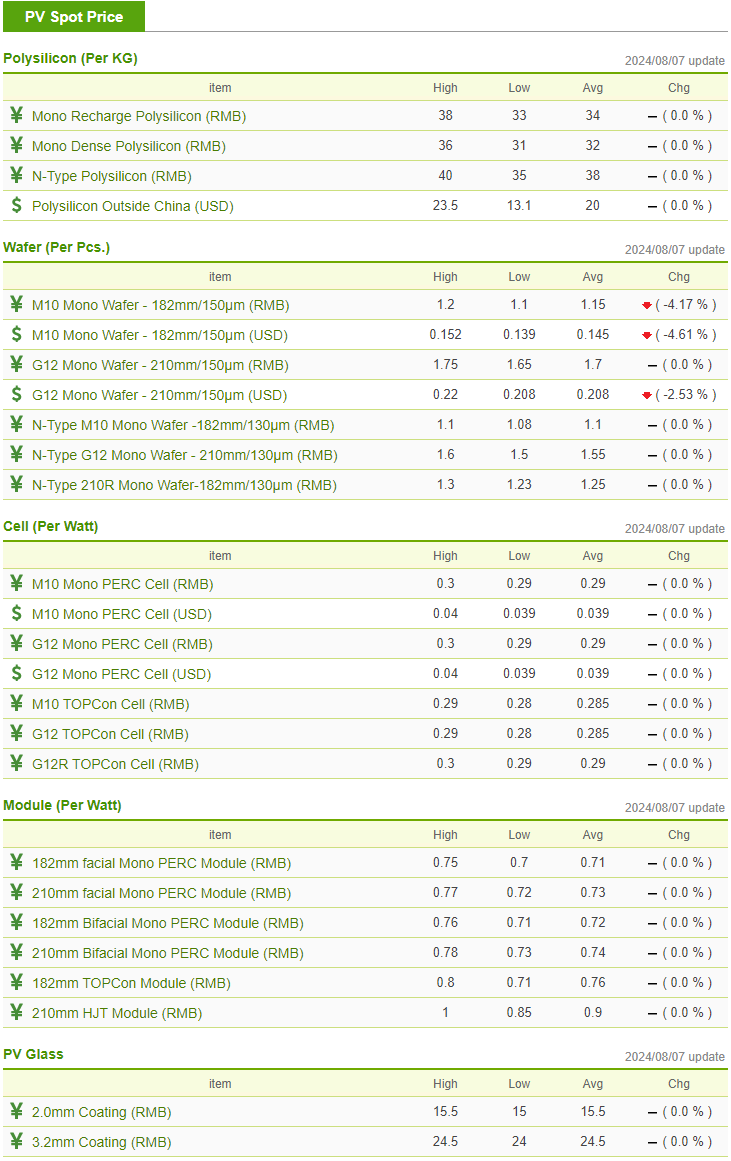 2024년 7월 4주부터 8월 2주까지 3주간, 태양광 폴리실리콘 및 웨이퍼, 셀, 모듈 가격 동을 주요 사이트를 통해서 가격 동향을 살펴보겠습니다.